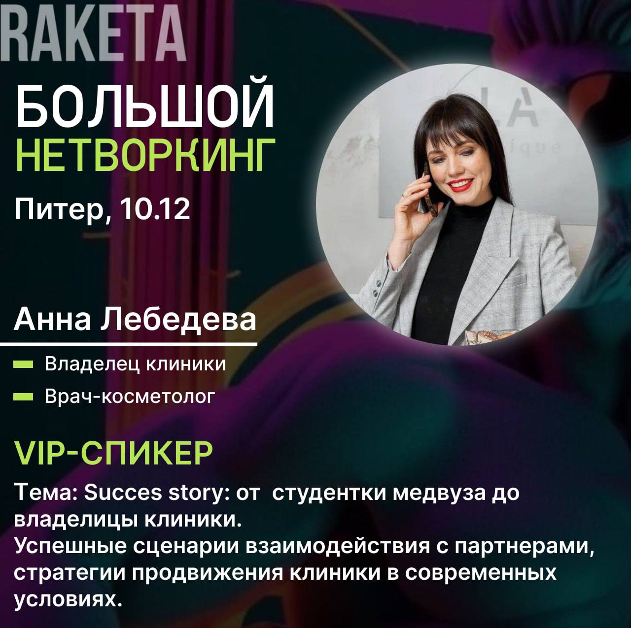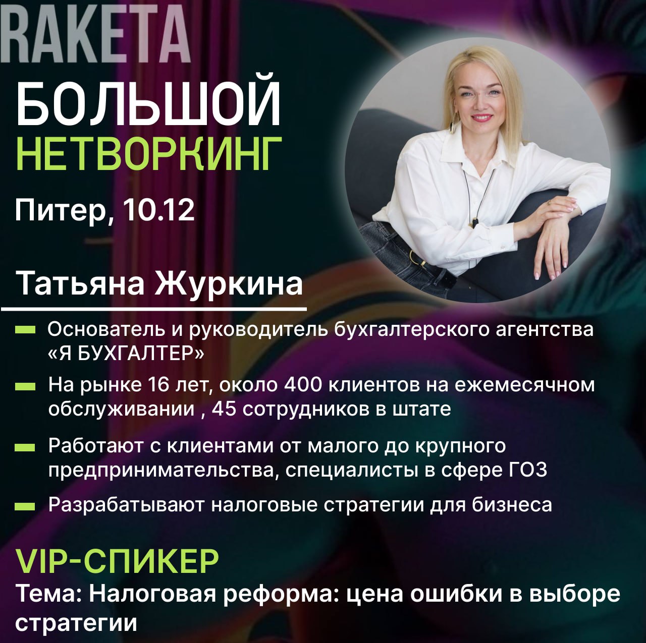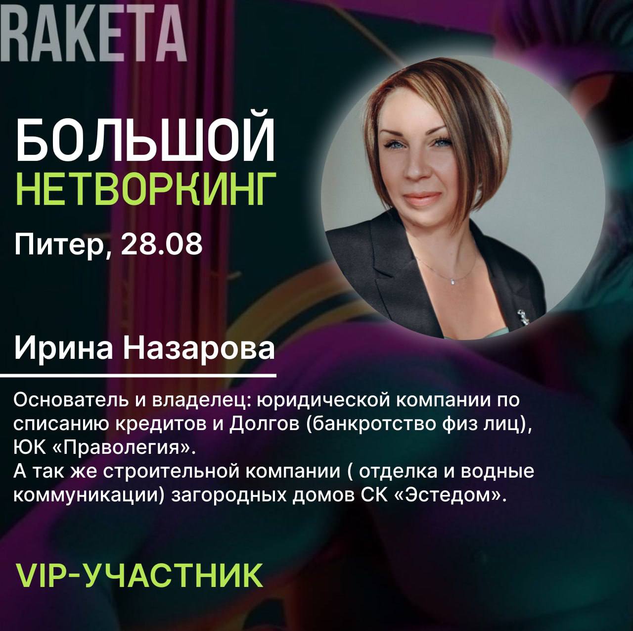 В течение дня, в комфортной и располагающей обстановке, пройдет нетворкинг среди предпринимателей, экспертов. Мероприятие будет ориентировано на активное взаимодействие между участниками, обмен опытом и идеями. Мы обсудим актуальные темы, касающиеся развития бизнеса, личного бренда, сделаем акцент на личном и профессиональном росте.